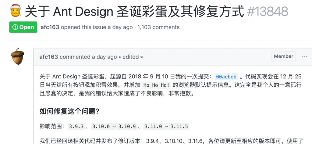 今天的这段代码来源于 Ant Design。 不知道还有没有人记得去年闹得轰轰烈烈的圣诞彩蛋事件: